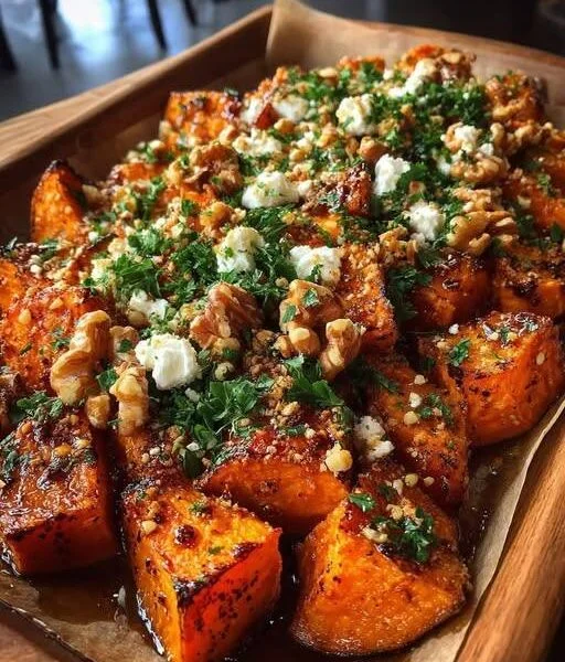 These roasted sweet potatoes are caramelized until deeply golden, coated in warm spices, and drizzled with pure maple syrup that turns into a glossy, sticky glaze in the oven. Once roasted, they’re topped with creamy feta, crunchy walnuts, fresh herbs, and a sprinkle of seeds for texture. It’s a vibrant, rustic side dish that tastes both comforting and gourmet — perfect for holiday tables, weeknight dinners, or potlucks.
