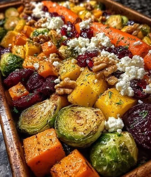 Add Toppings: Remove the pan from the oven. Immediately sprinkle the hot vegetables with the chopped walnuts, dried cranberries, and crumbled feta cheese. The heat will slightly warm the toppings.