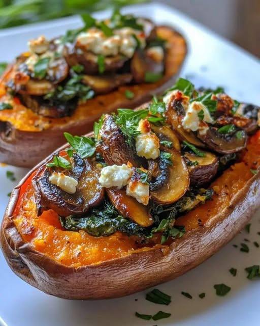 That image looks like a fantastic and nourishing meal! Based on the ingredients you listed and the image, here is a full, high-quality recipe for Stuffed Sweet Potatoes with Sautéed Spinach, Mushroom, and Feta.